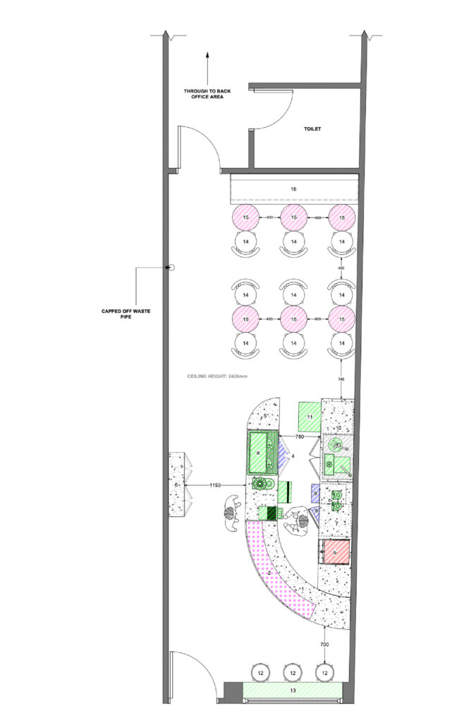 Thoughtful layout planning allowed for a fully equipped open hatch prep kitchen, a spacious counter with UV-welded glass displays, and ample seating.